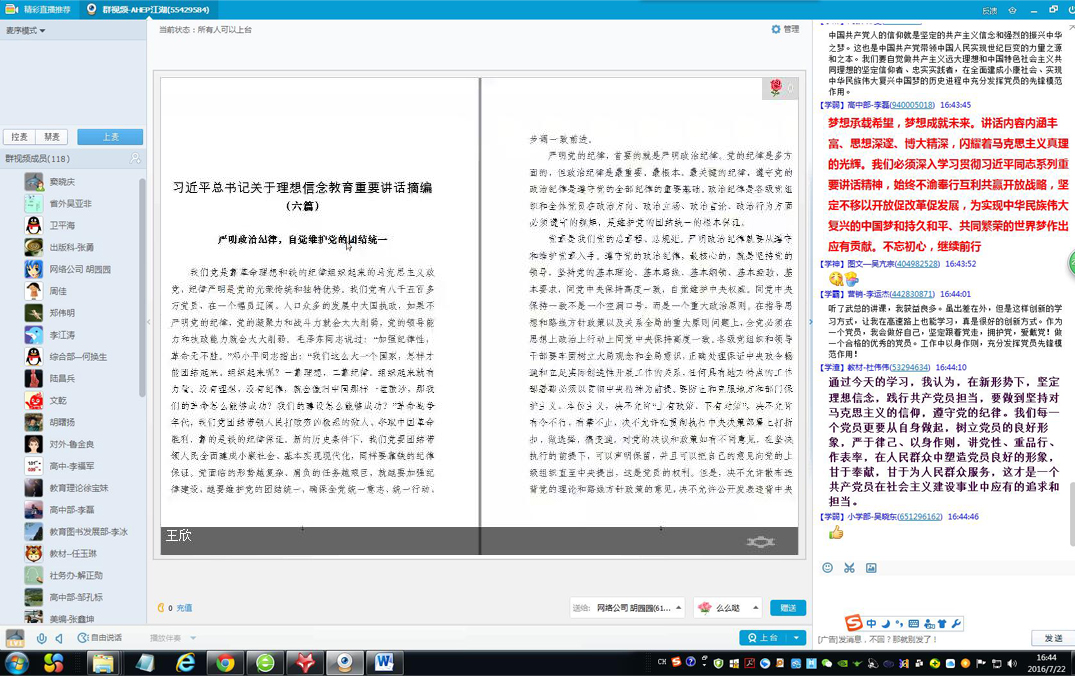 促进“两学一做”学习教育深入开展,进一步加强党员的思想政治教育,7月22日下午安徽教育出版社党支部以“坚定理想信念,明确政治方向”为主题,组织开展了一堂主题突出、形式创新、互动充分的QQ群线上讲党课活动。安徽教育出版社全体党员、入党积极分子以及部分普通员工通过QQ参与此次授课。有三位党员同志尽管在出差的途中,但仍通过手机QQ收听了此次党课。