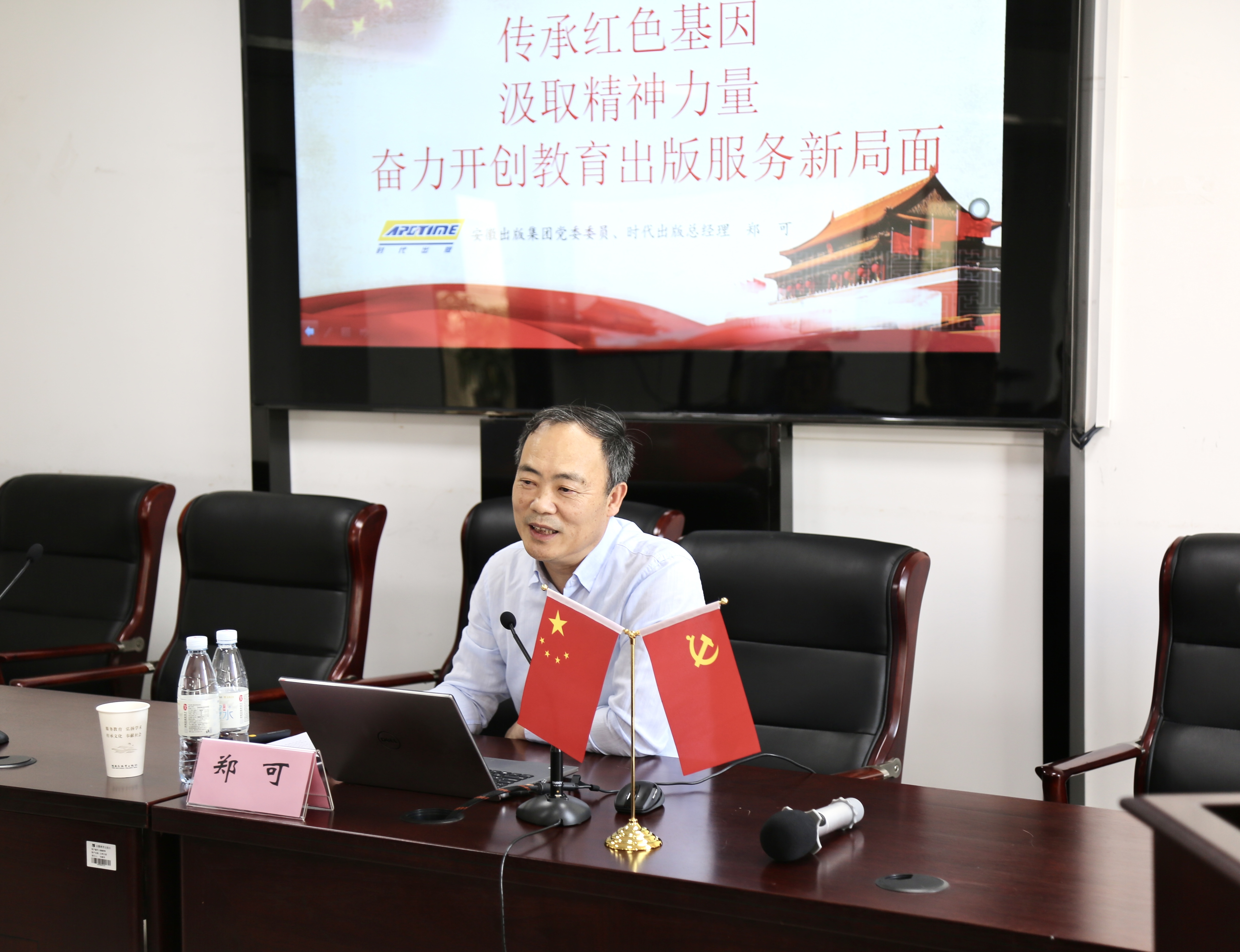 为深入推进党史学习教育,迎接中国共产党成立100周年,2021年6月24日下午,安徽出版集团党委委员、时代出版传媒股份有限公司总经理郑可在安徽教育出版社以《传承红色基因 汲取精神力量 奋力开创教育出版服务新局面》为题,为安徽教育出版社党总支和安徽省教材出版中心党支部的党员上了一堂生动翔实的党史学习教育专题党课。