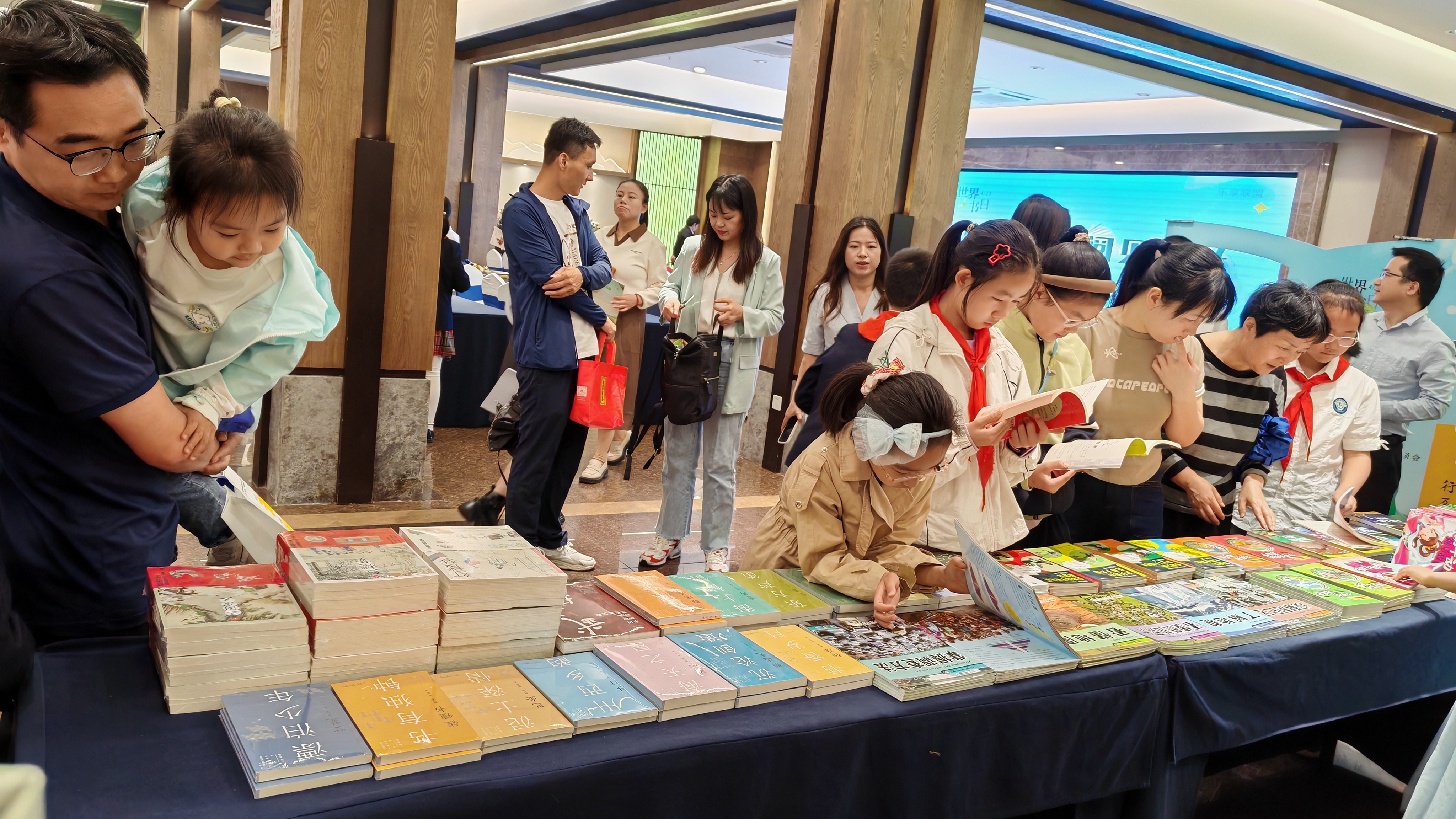 活动于2025年4月19日上午在合肥市披云徽府酒店举办。活动伊始,我社向参加活动的居民和学生赠送了《红蜻蜓》杂志,带领读者参观了安徽教育出版社微书市。小小的书市上人头攒动,购书者络绎不绝。