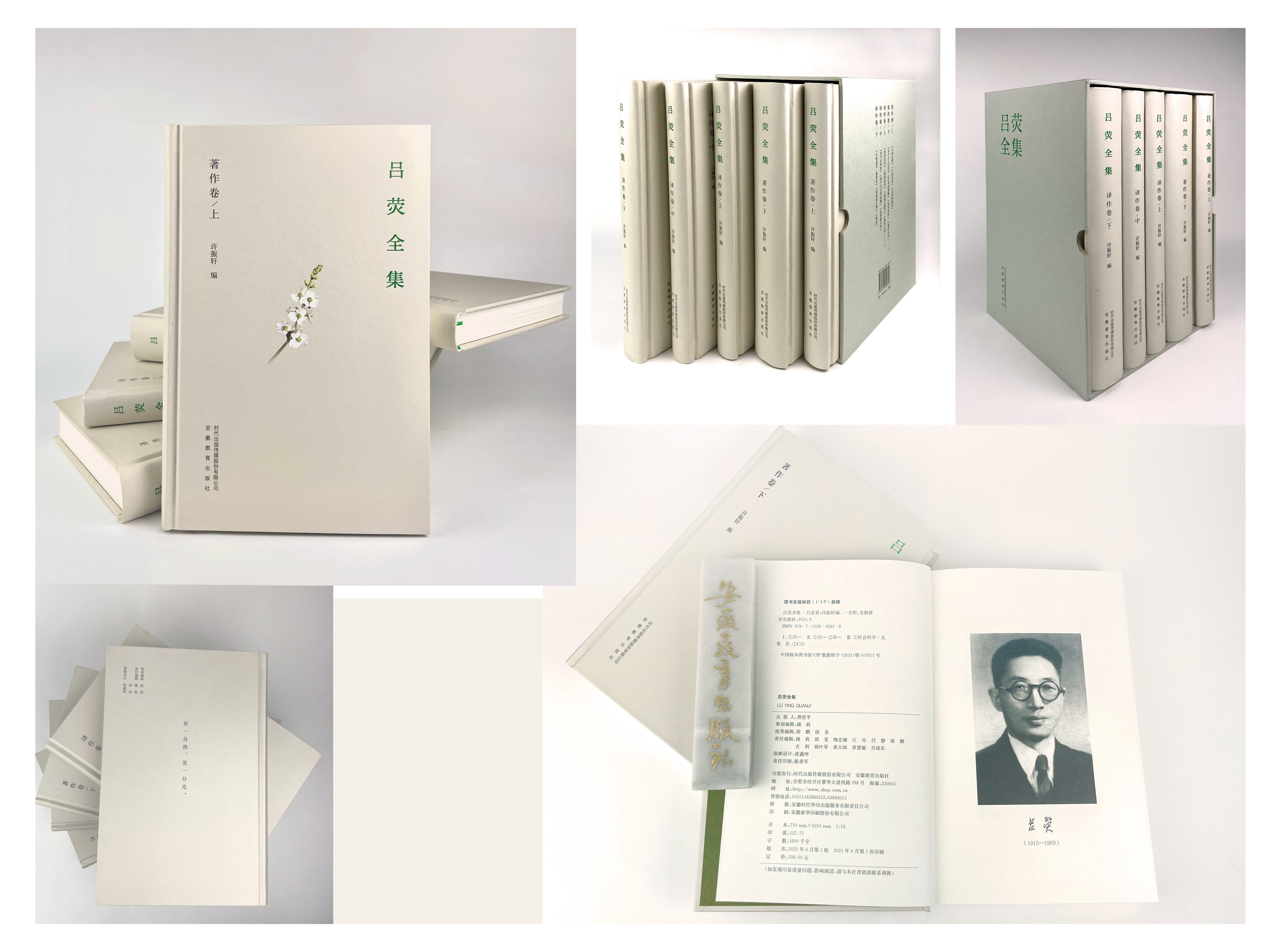 我没有参与《吕荧全集》的装帧设计,但我在手捧新书之后对其装帧设计较为赞赏。吕荧美学思想中有个命题是“反对机械化”,主张“人性化”。该书设计摈弃了图案化的传统,进行了人性化的探索。吕荧先生面貌清秀,言行有诗人气质。《吕荧全集》设计版式略窄长,封面没有大红大绿,而是取像晨星初现的淡淡蓝空,淡雅,深沉,清气弥漫,一枝素雅洁白的茨菇花,斜插封面的上方,象征着吕荧先生的生命遭际和高洁品德,使人捧读全集时,产生书为其诗、书为其文、书为其人的遐想与美感。这一设计我认为是非常成功。