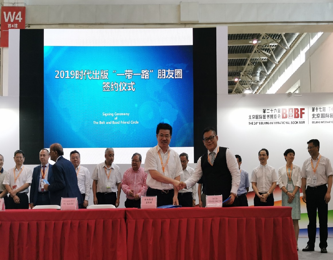 8月21日上午,安徽教育出版社在时代出版传媒股份有限公司的统一安排下,参加了安徽出版集团“庆祝中华人民共和国成立70周年,时代出版‘一带一路’朋友圈高峰会”活动,并与“一带一路”合作伙伴签约。在新中国成立70周年即将到来之际,安徽教育出版社深度拓展战略合作和资本合作,围绕弘扬主旋律与中华优秀传统文化传承发展的主题,就共同开发出版产品、打开丝绸之路沿线市场和文化交流推广等方面的业务进一步拓展合作。安徽教育出版社与马来西亚智库出版社、美国思凯乐出版社就《熊秉明全集(10卷)》《一条大河波浪宽:1949—2019中国治淮全纪实》等重点书和主旋律图书签订版权输出协议。