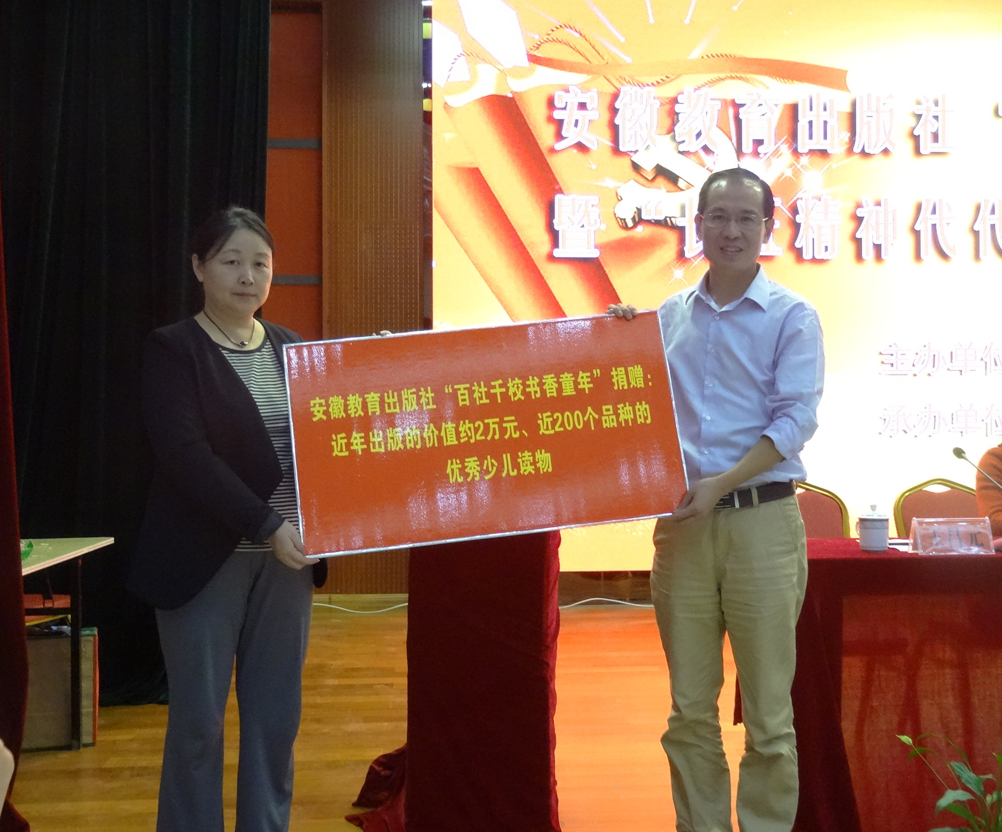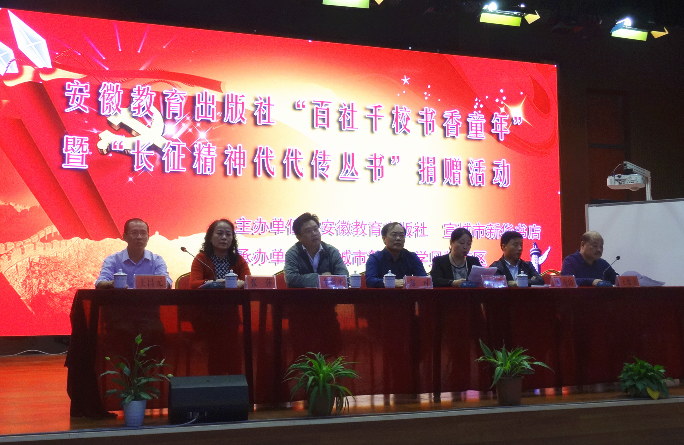 为隆重纪念长征胜利80周年,积极落实国家新闻出版广电总局《关于开展“百社千校书香童年”阅读活动的通知》,安徽教育出版社于10月19日,在宣城市第二小学贝林校区举行“百社千校书香童年”暨“长征精神代代传丛书”捐赠活动。活动上,安徽教育出版社向学校捐赠了包括“长征精神代代传丛书”在内的近200个品种,价值2万元的优秀少儿读物。安徽出版集团党委委员、时代出版传媒股份有限公司监事会主席、安徽教育出版社社长郑可、安徽教育出版社总编辑张丹飞出席活动。