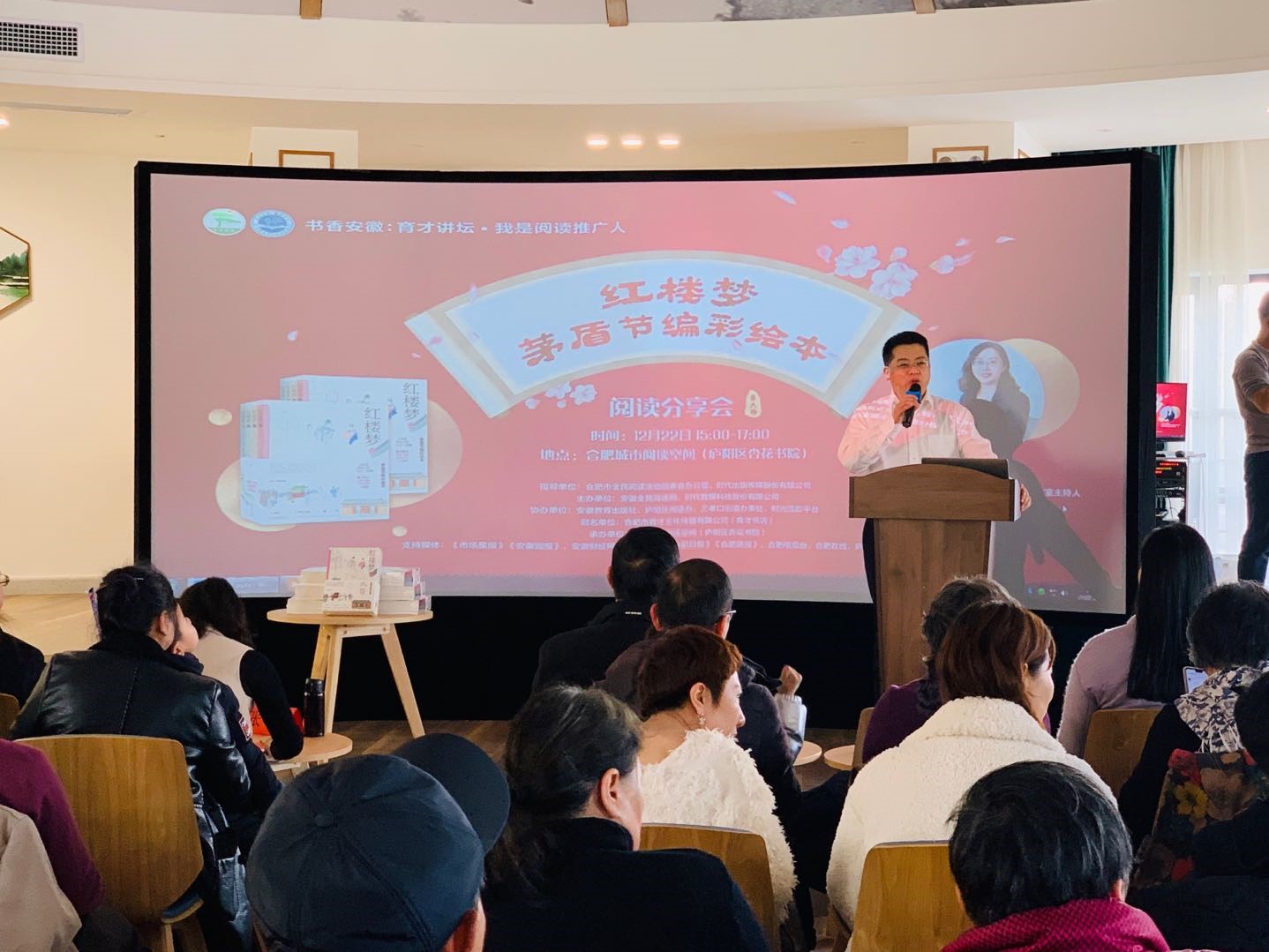 2019年12月22日下午,由合肥市全民阅读活动组委会办公室、时代出版传媒股份有限公司指导,安徽全民阅读网和时代数媒科技股份有限公司主办,育才书店冠名,安徽教育出版社、时光流影平台和庐阳区杏花书院等单位协办的“书香安徽:育才讲坛·我是阅读推广人(第六场):茅盾节编彩绘版《红楼梦》阅读分享会”在合肥市庐阳区杏花书院成功举办。