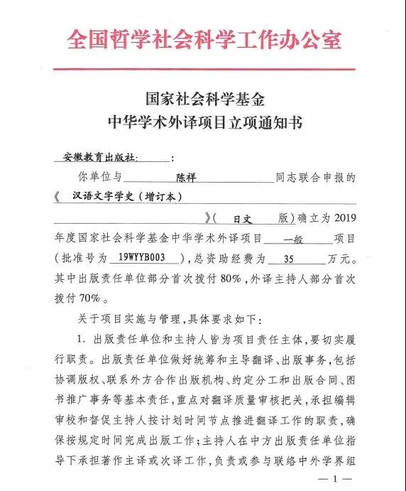 近日,全国哲学社会科学工作办公室公布了2019年国家社会科学基金中华学术外译项目立项名单,其中安徽教育出版社与译者联合申报的《汉语文字学史(增订本)》(日文版)入选并获得资金资助,这是安徽教育出版社首次入选该项目,也是安徽出版此次唯一入选项目。