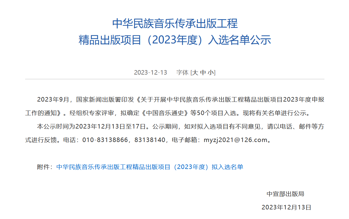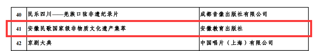 2023年12月13日,中宣部出版局公示中华民族音乐传承出版工程精品出版项目(2023年度)入选名单,安徽教育出版社《安徽民歌国家级非物质文化遗产集萃》成功入选。