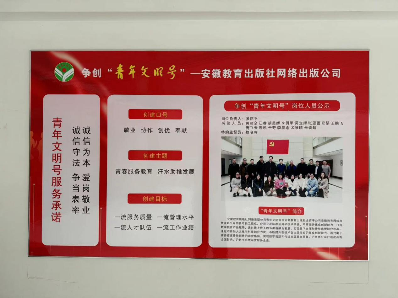 安徽教育出版社网络出版公司秉承敬业、协作、 创优、奉献的精神和“以人为本,青年先行”的理念,始终把创建“青年文明号”作为凝聚青年、团结青年、带领青年建功立业的重要抓手,为青年员工提供助力成长与创新发展的工作平台。