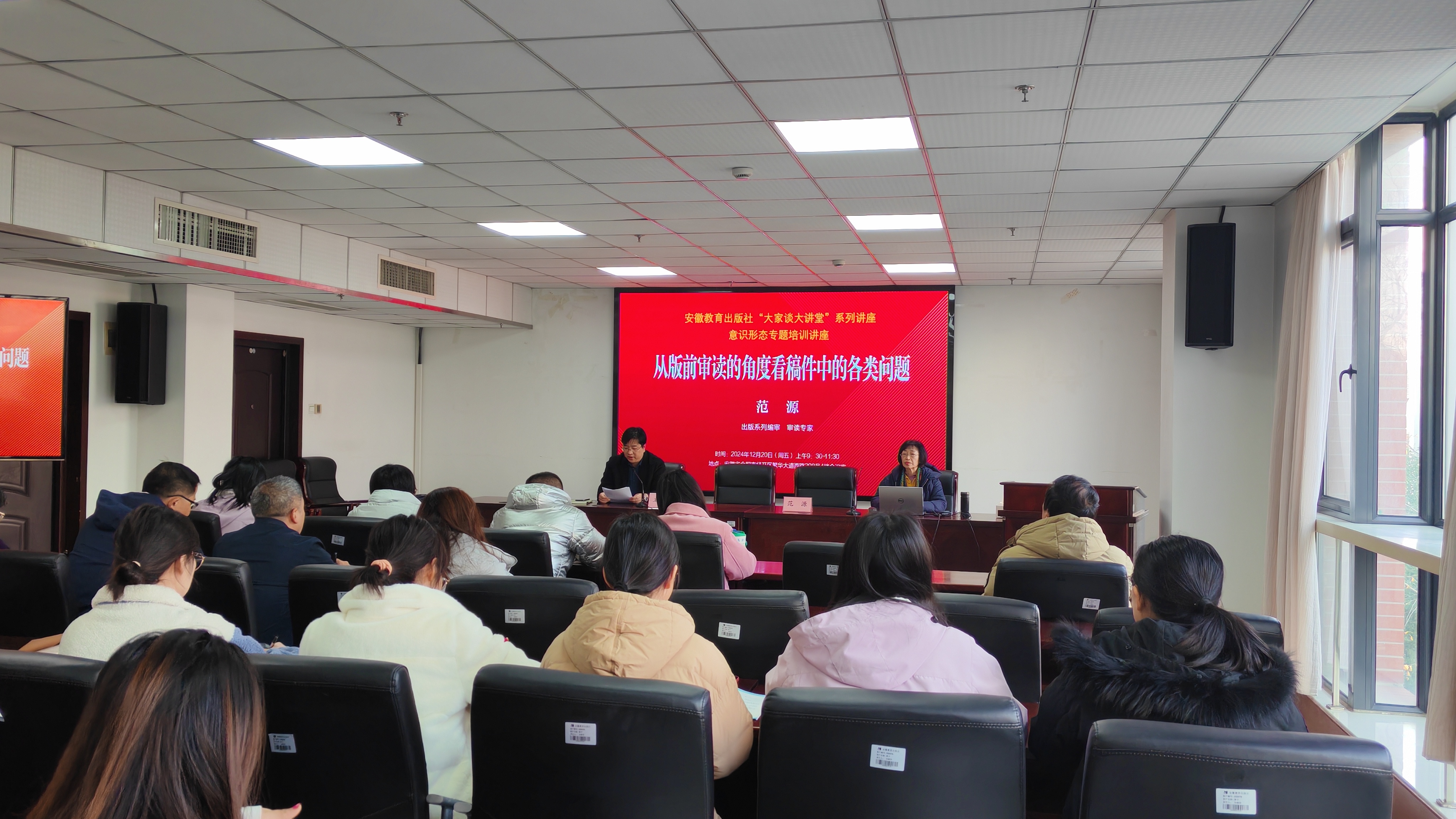2024年12月20日,安徽教育出版社开展“大家谈大讲堂”系列讲座专题培训讲座活动,邀请出版专业技术编审、审读专家范源老师做“从版前审读的角度看稿件中的各类问题”主题讲座。活动由李冰冰总编辑主持,出版社全体编校人员参加。